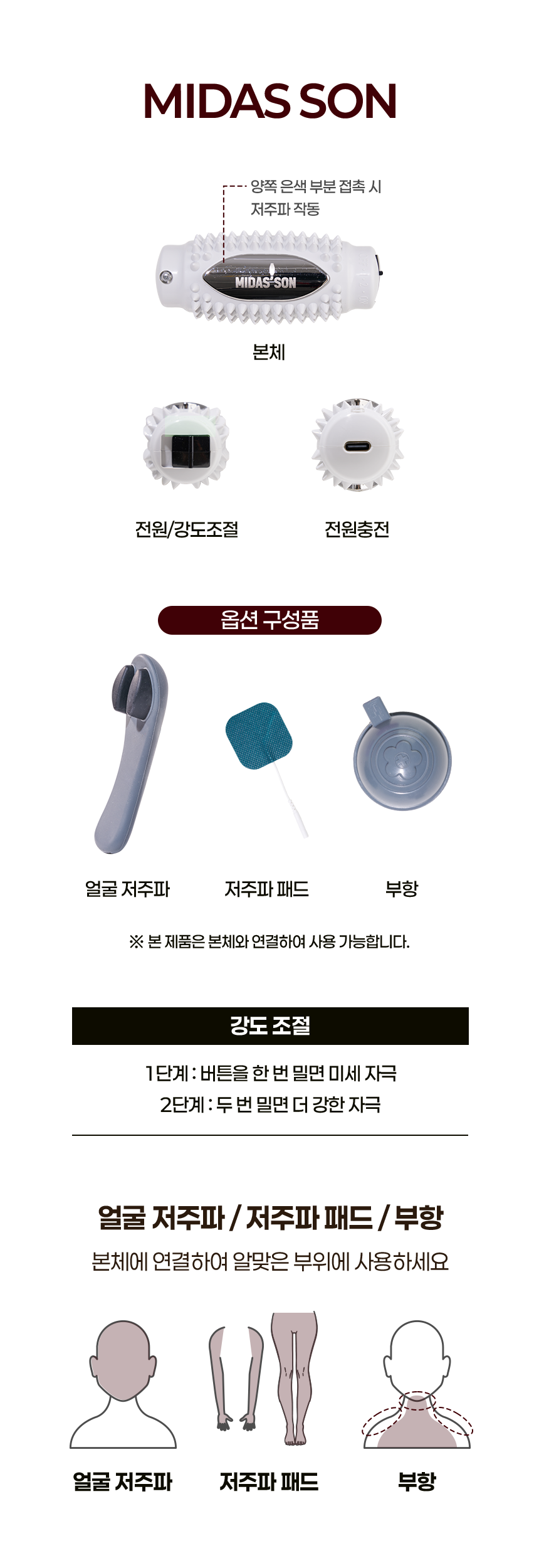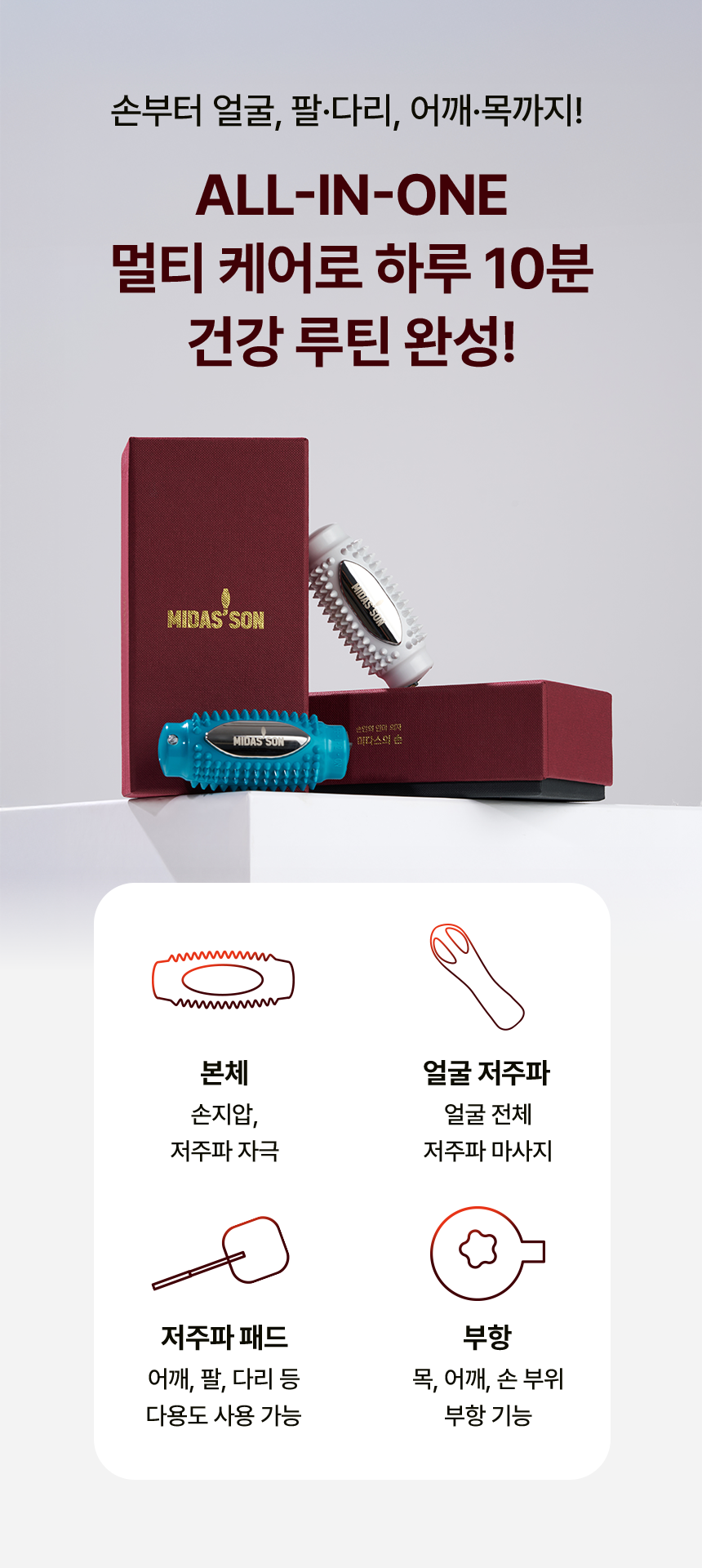 미다스의 손_종합세트 손 안의 안마의자 주요 스펙 용량 및 사양 종합세트 본체 1, 얼굴저주파, 저주파패드 x 2 부항x 2, 연결선, 연결고무패드 브랜드명 미다스의 손 소비자 가격360,000원