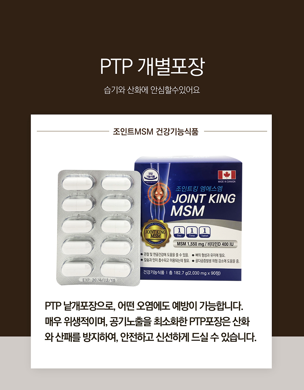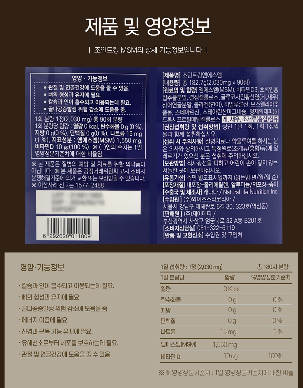 약국전용상품(수입산) [약국전용]조인트킹MSM 180정(건강기능식품) [약국전용]조인트킹MSM 180정(건강기능식품) 주요 스펙 용량 2,030mg x 90정 x 2box 주원료 엠에스엠(MSM), 비타민D3 초록입홍합추출물, 글루코사민황산염, 상어연골분말 콜라겐(연어), 히알루론산, 보스웰리아추출물 브랜드명 조인트킹 소비자 가격120,000원
